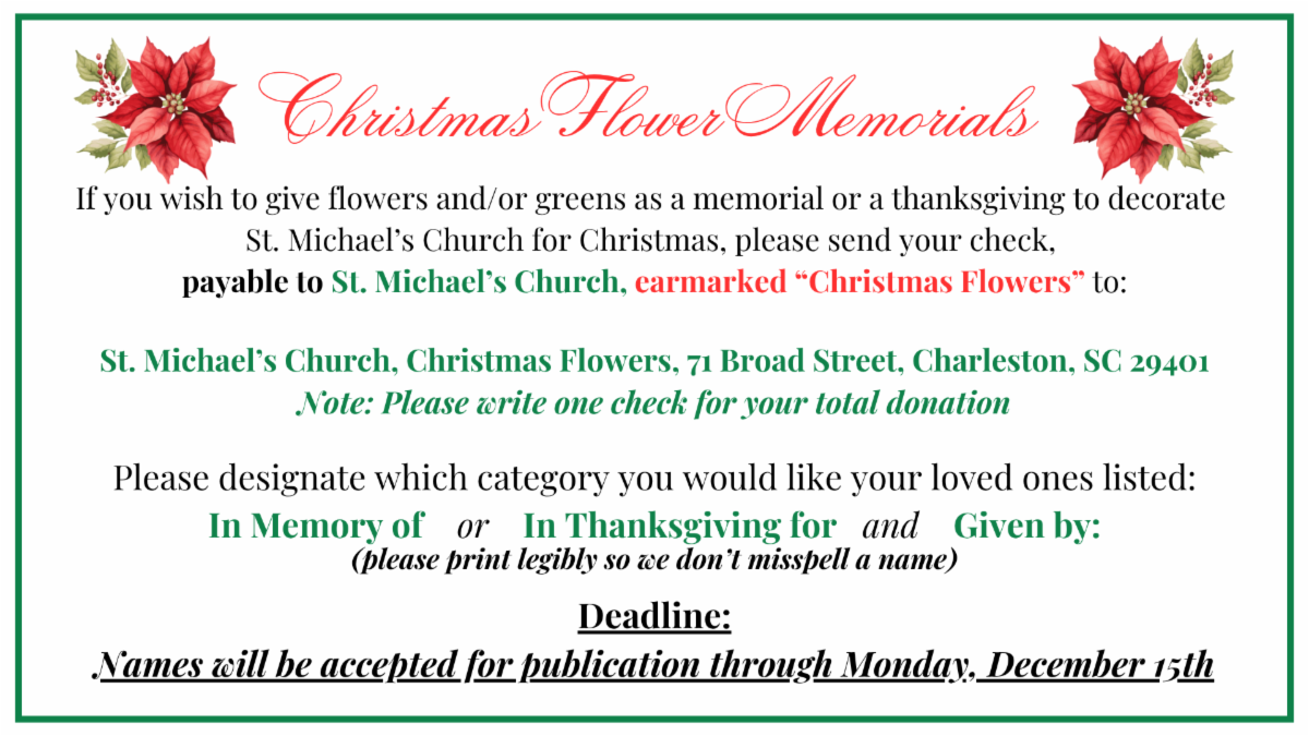 We are now accepting donations for Christmas Flower Memorials. Please send your check, earmarked "Christmas Flowers", in by Monday, December 15th to the address listed below.