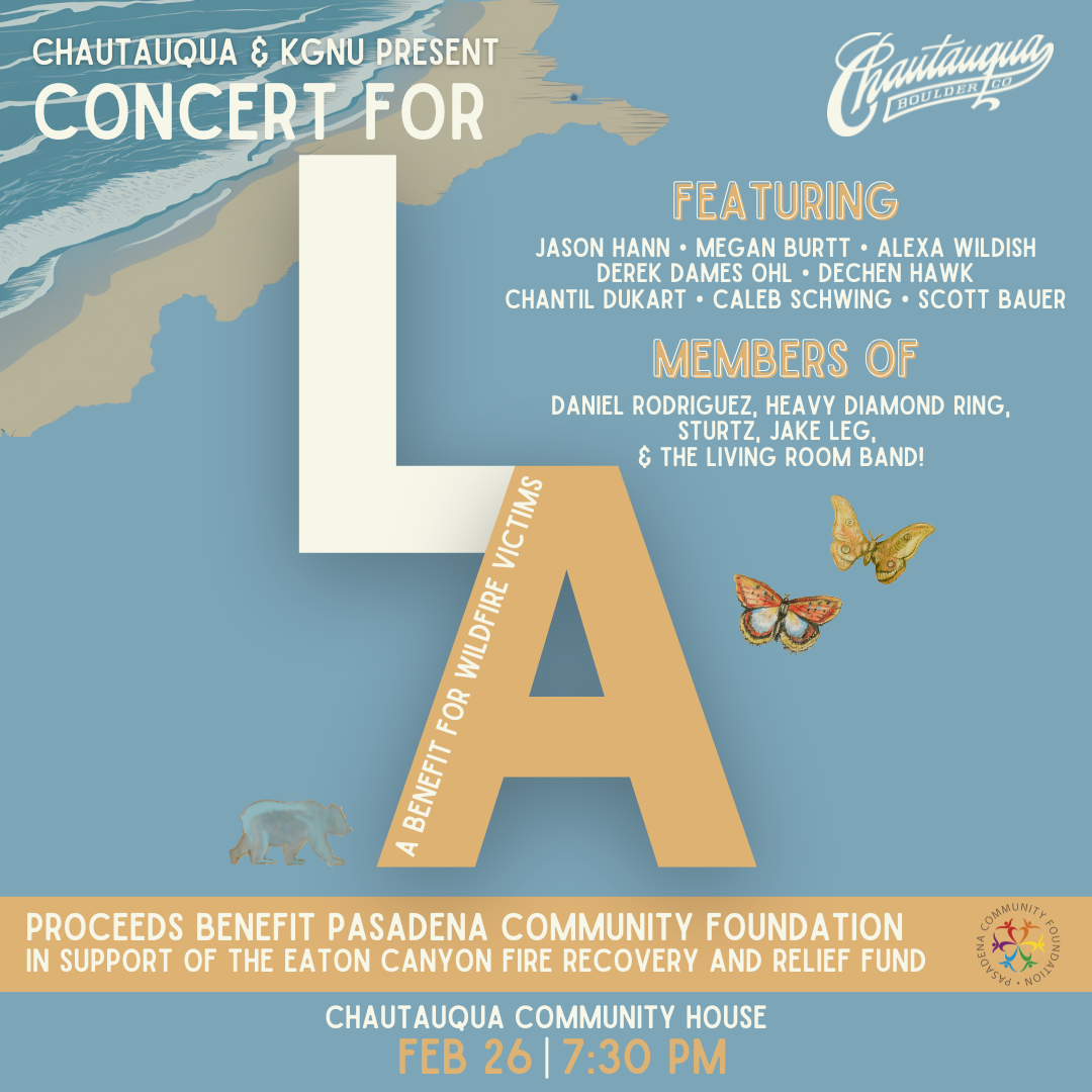 The Colorado Chautauqua will host a night of music and giving to benefit wildfire victims on February 26, 2025 at 7:30 p.m. The concert will feature performances from an array of local artists including Jason Hann (String Cheese Incident), Megan Burtt, Alexa Wildish, Derek Dames Ohl, and more. All proceeds from the Concert for LA will support those impacted by the devastating Eaton Fire, with funds going to the Eaton Fire Recovery and Relief Fund through the Pasadena Community Foundation. Learn more and purchase tickets here.