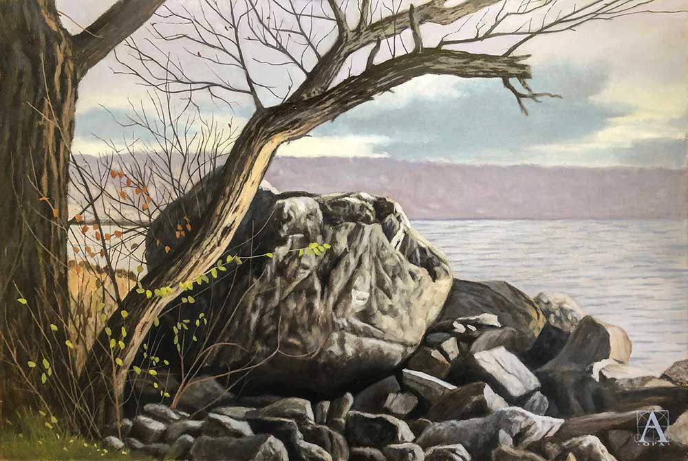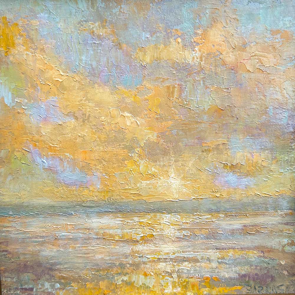 The featured piece for October is "Serenity" by Mireille Duchesne. It's a 24" x 24" landscape in oil, priced at $1,900.