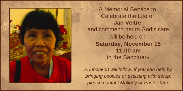 We give thanks for the life of Jan Veltre who entered eternal life on October 29th. Well done, good and faithful servant.
