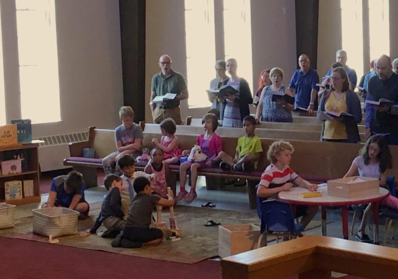 As many of our church family saw and had the chance to experience during the summer months, beginning in mid-June, we started to experiment with the creation of a warm and flexible space in our sanctuary in which children and families – as well as any other older youth or adults who wanted to help welcome and experience worship with some of the youngest members of our church family – could be in worship. We created this space by removing a few of the front pews on the non-pulpit side of the sanctuary and adding a donated rug and some toys, as well as borrowing an art table from our friends at Harborlight Nursery School and moving our bookshelf of children’s books and Bibles forward into the space. The idea behind this Prayground space grows from the knowledge that children are uniquely and wonderfully created (as are we all!) as children. They need to move, at times. They need space to wiggle out the wiggles that God puts in children by nature. Increasingly, we see in early childhood and elementary education that when children are given space to move and use their bodies as they listen and as they learn, they are actually