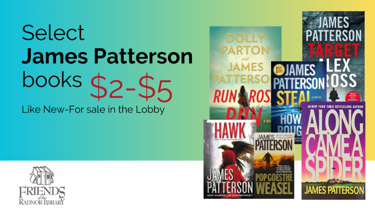 The Friends of the Radnor Library are selling like-new books by James Patterson in the lobby of the Library. Find your favorite titles for $2-$5 each. All sales benefit the Library.
