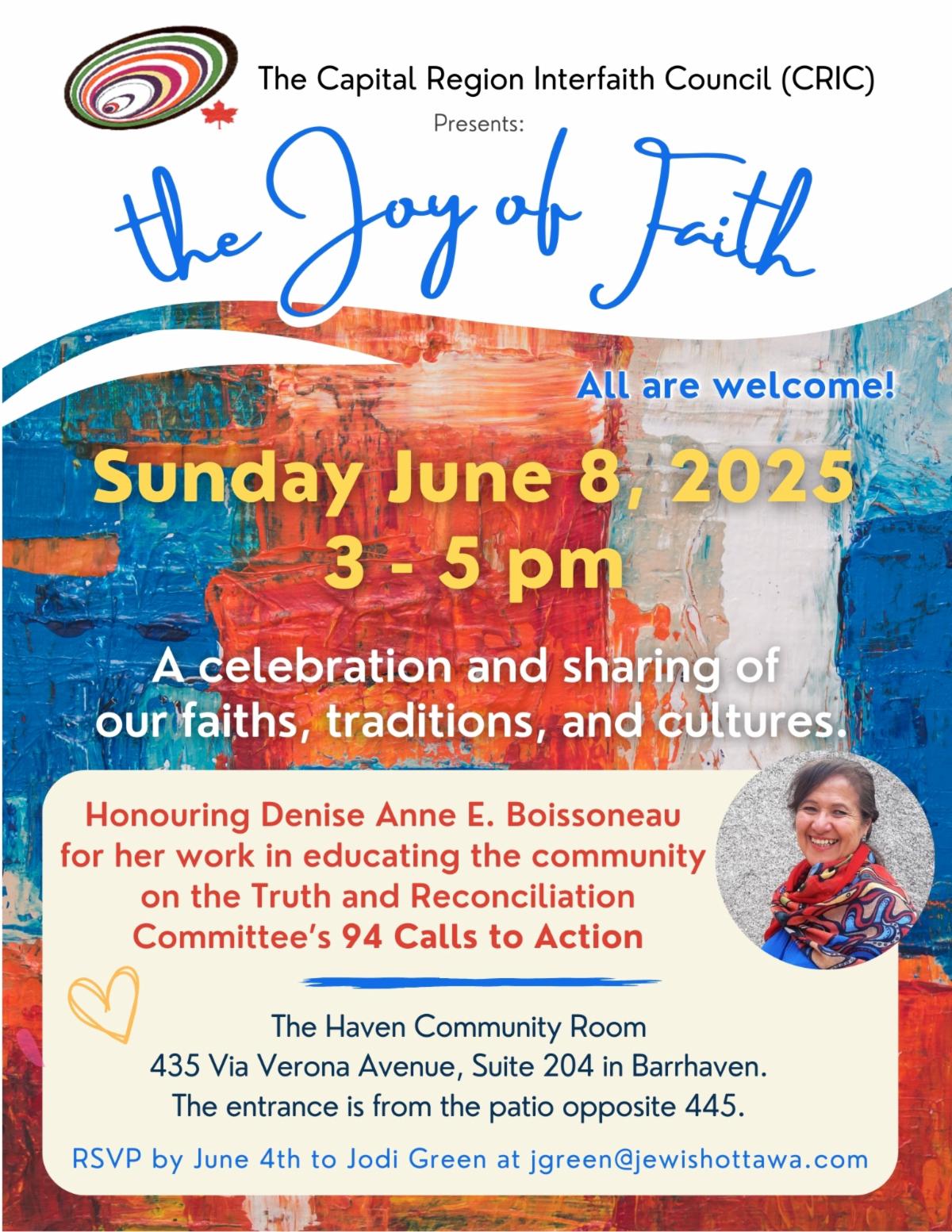 Joy of Faith Celebration: Many faiths come together for food, friendship, and honouring a local Indigenous leader. Presented by the Capital Region Interfaith Council, 3:00 to 5:00 p.m.