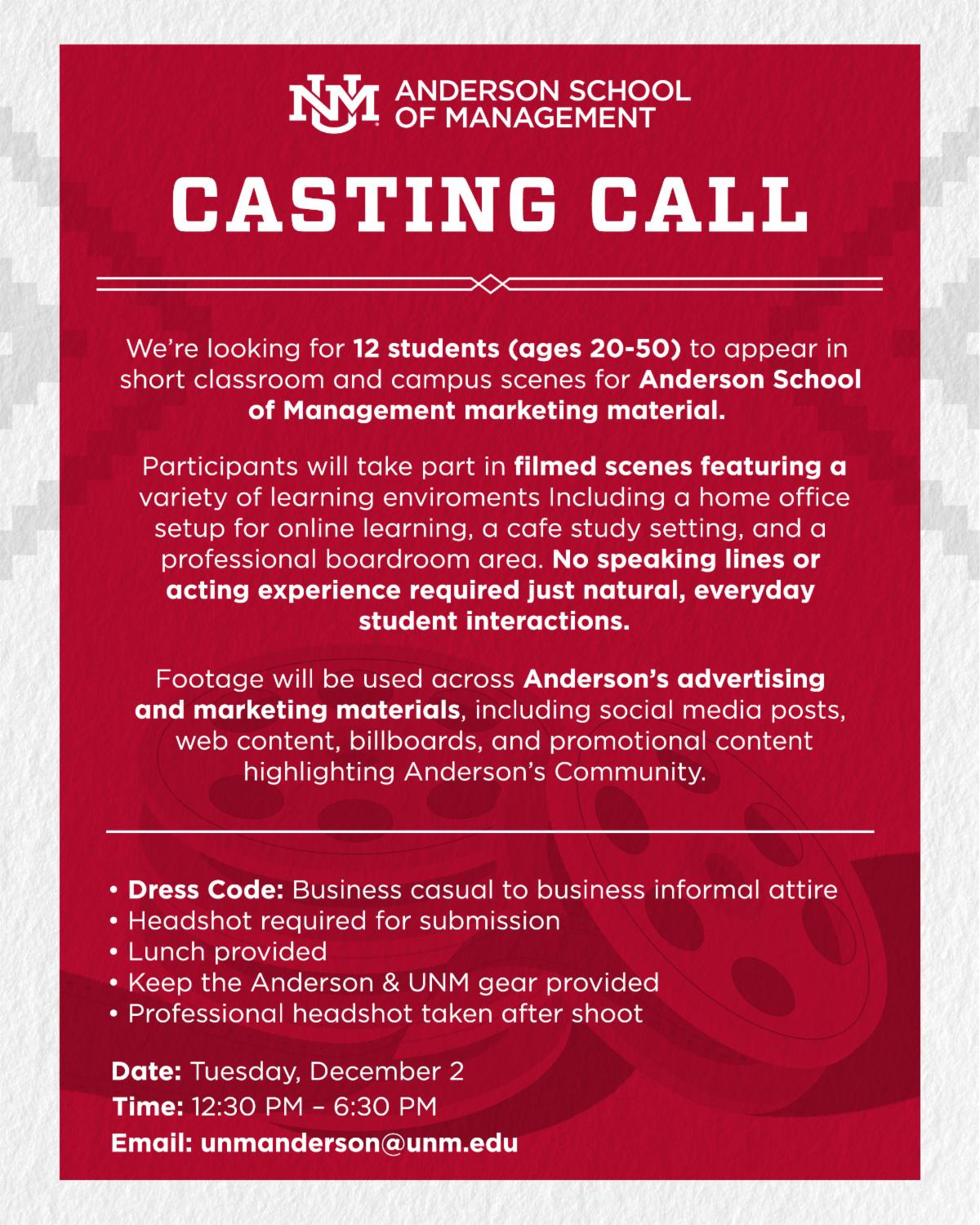 If you’re interested in auditioning, check out the project details above and submit your info by the posted deadline to unmanderson@unm.edu. We’d love to see you get involved!