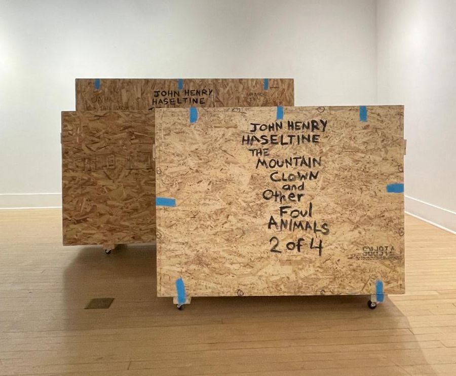The Mountain Clown and Other Foul Animals is an irreverent jab at our cultural mythologies, specifically our Western and Pioneering narratives. Utilizing toys, puppets, performance and comics in addition to painting, Haseltine explores how both self-produced folk art and kitsch mass production equally contribute to the legacy of western mythology. He’s interested in the parallels between historical western expansion and contemporary gentrification in the region, as well as the ways stories can be manipulated to represent local and personal identities.