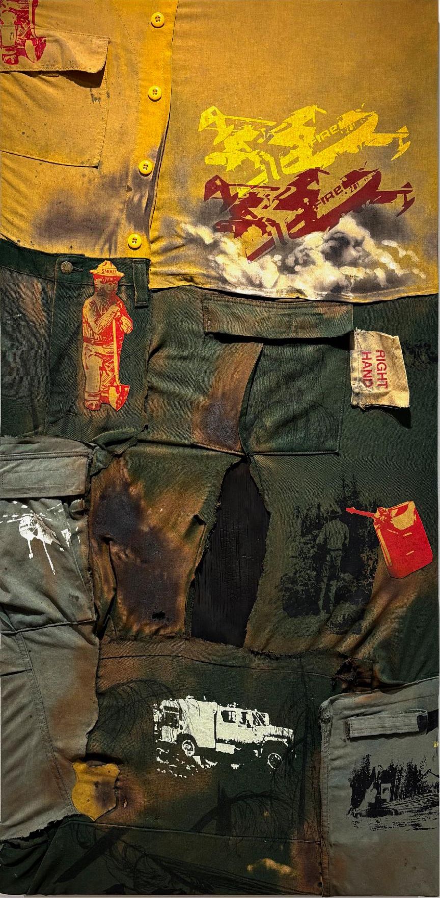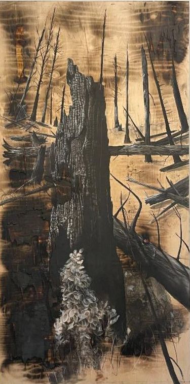 "A century of fire suppression, the loss of Indigenous cultural burning, and climate change have created today’s wildfire crisis. It is not a matter of if a fire will come, but when. Federal land employees work tirelessly with little progress, caught between containing fires and restoring damaged landscapes. As hotter, drier climates push fire back into the land through both destruction and controlled burns, my creative process seeks to illuminate this complex history. Through painting, burning, drawing, and textiles, I open different entry points into the wildfire conversation. My research expands on acknowledging and redefining America’s relationship with fire."