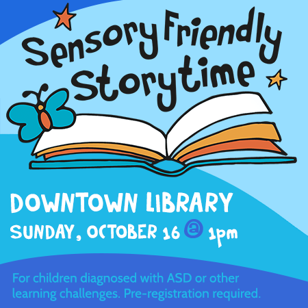 Join us for a Sensory Friendly Storytime, for children diagnosed with ASD or other learning challenges. Families are welcome to meet the librarians, participate in crafts and enjoy the stories.