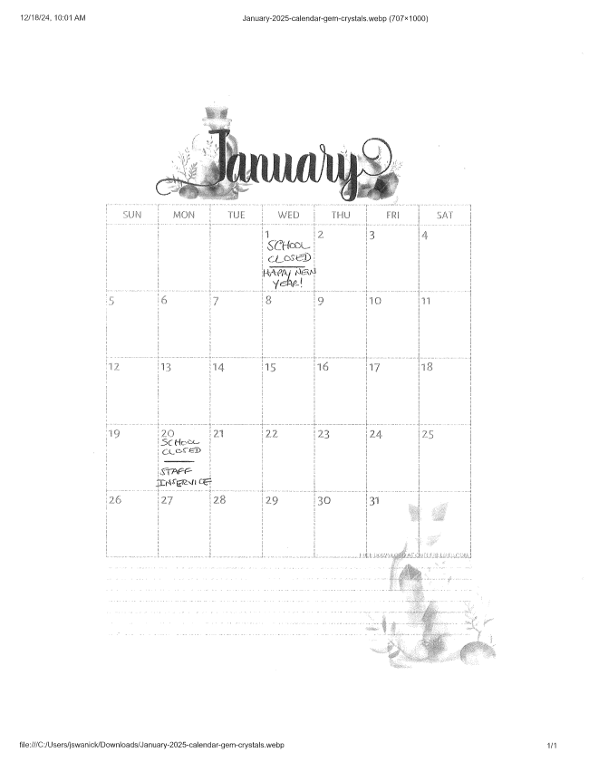 - School Closed - Monday, January 20th for a staff in-service day.