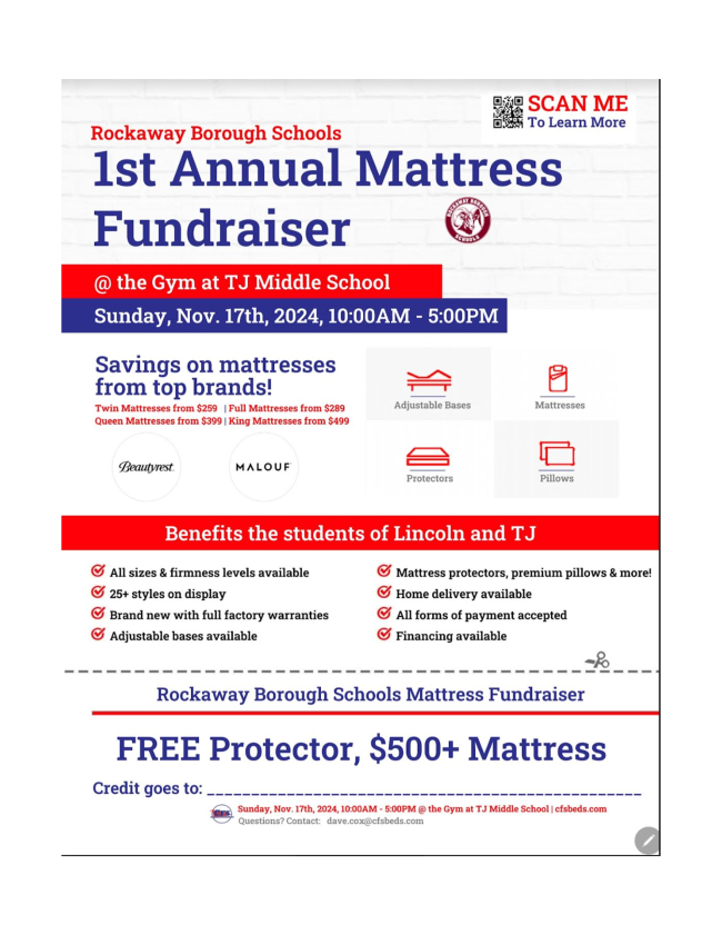 We are excited to being a new fundraising season. Last year, we were able to donate communication folders for students, outdoor recess equipment, ice pops and water for Field Day, fund one Morris Hills High School student a $1,000 scholarship, beautification for the fall and spring, donate towards the 8th grade fund. We were also able to celebrate the teachers during Teacher’s Appreciation Week with a food trucks, massages, breakfast, $1,500 to redo both TJ and Lincolns Teachers break room, replenish snack baskets for staff throughout the year and treat teachers to coffee or dinner on late nights at the school. We fulfilled multiple mini grants from staff! Additionally, the RBHSA provided staff with an Amazon gift card at the beginning of the year to use towards their classroom needs and did so again this year, including our amazing para professionals and support staff.