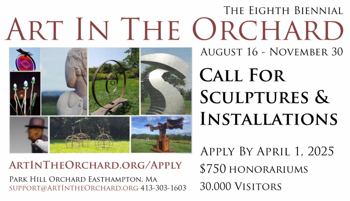 Art In the Orchard is seeking large, durable, free-standing, outdoor sculptures and installations to be displayed in the fruit gardens of Park Hill Orchard in Easthampton, Massachusetts, August 16 through Thanksgiving. No fee. Deadline: April 1, 2025.