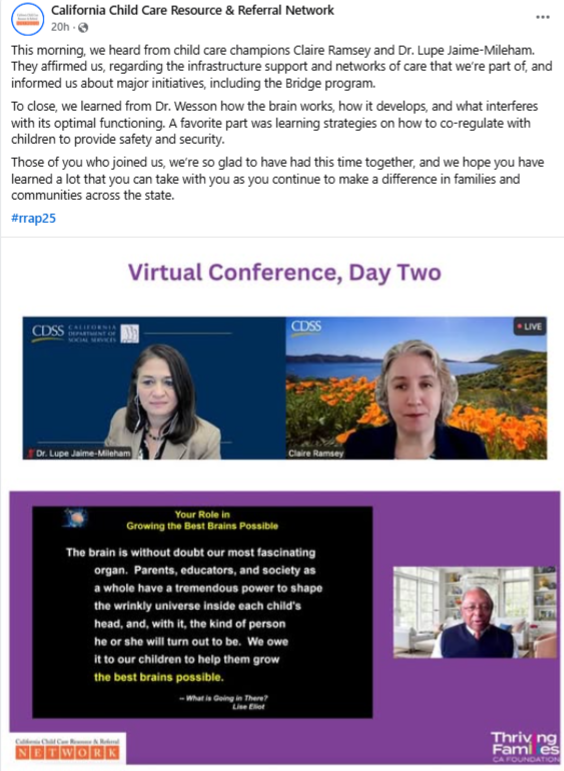 Last week, Thriving Families CA Foundation and The R&R Network hosted the virtual portion of our joint conference, and it was a huge success! On behalf of the Network and TFC, we want to thank you for attending the 13th Annual Joint Conference (and the 6th Annual VIRTUAL Joint Conference).