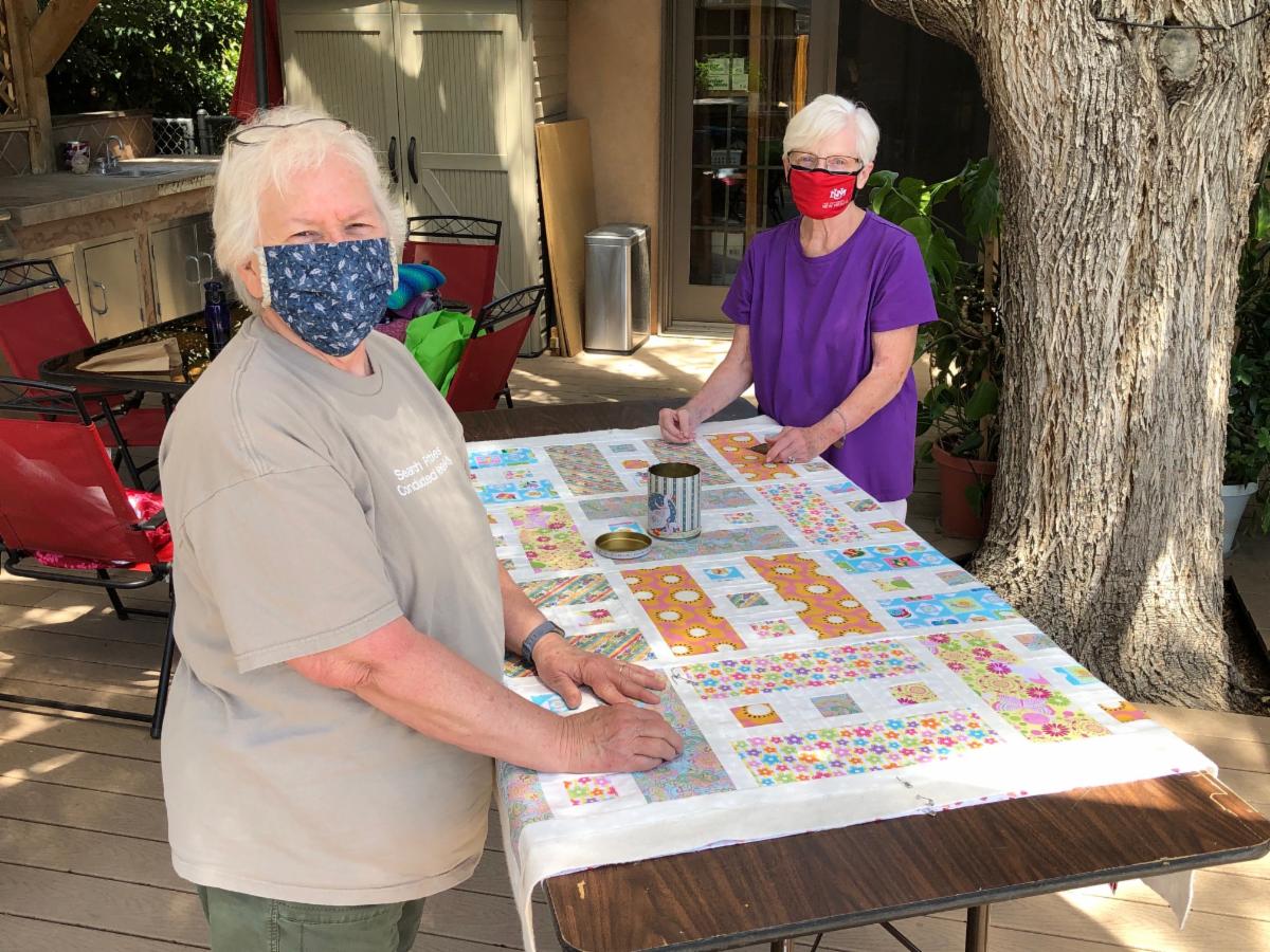 Ann Look and Donna Bruce pinning quilts for Basket of Hope.