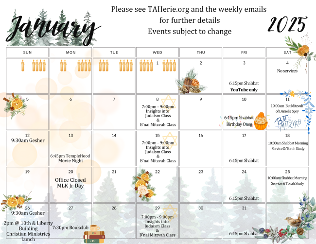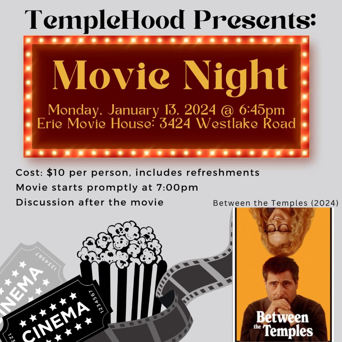 TempleHood Movie Night! Scheduled for Monday, January 13, 2025 at 6:45pm. Between the Temples starts promptly at 7:00pm. Discussion afterwards. Tickets are $10 and include refreshments. RSVP here. All proceeds benefit TempleHood.