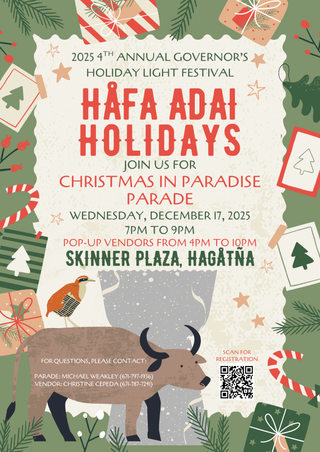 The Office of the Governor welcomes the entire island community to join in one of the season’s most heartwarming celebrations, the 4th Annual Governor’s Holiday Light Festival Parade, taking place on Wednesday, December 17, 2025, from 7 p.m. to 9 p.m. at Skinner Plaza. This year’s theme, “Håfa Adai Holidays – Christmas in Paradise,” invites everyone to embrace the magic of the season in the heart of our capital city.