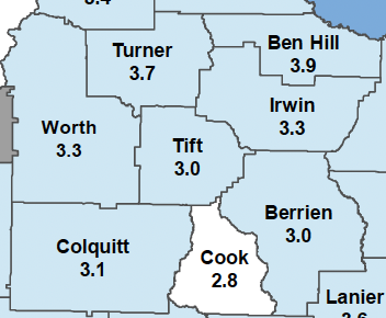 September's unemployment rates in area counties versus the previous month's rates were: Turner, 3.7% vs. 3.9%; Worth, 3.3% vs. 3.6%; Irwin, 3.3% vs. 3.4%; Cook, 2.8% vs. 3.1%; Berrien, 3.0% vs. 3.3%; and Ben Hill, 3.9% vs. 4.1%.