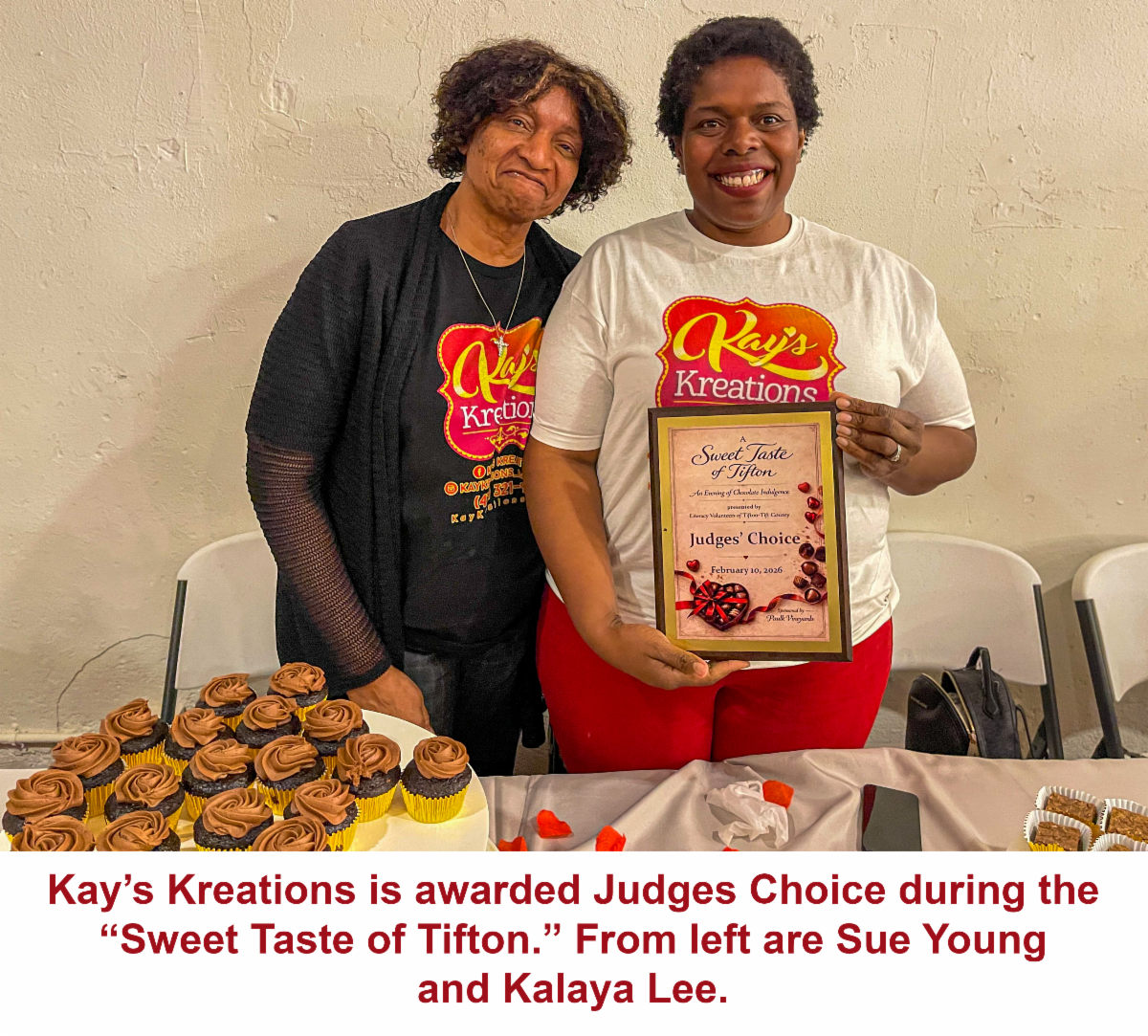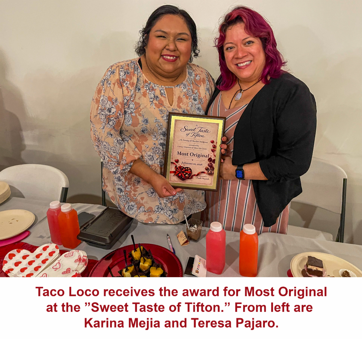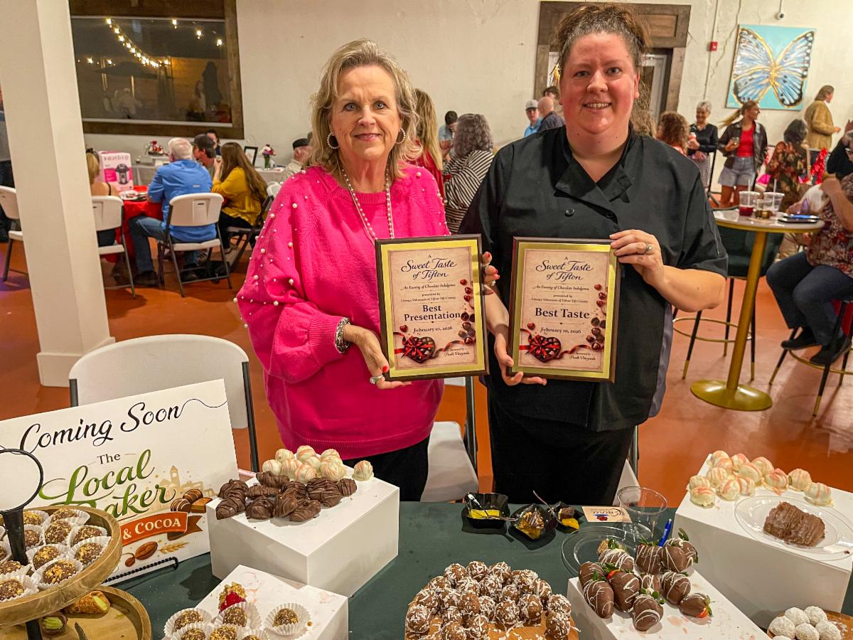 | The Local Graze/The Local Baker are awarded "Best Taste" and "Best Presentation" Tuesday night at the "Sweet Taste of Tifton," a fundraiser for Literacy Volunteers of Tifton-Tift County. From left are Gail Hargett and Karla Hargett. | LITERACY SUPPORTERS SAMPLE TIFTON'S BEST CHOCOLATES | | |