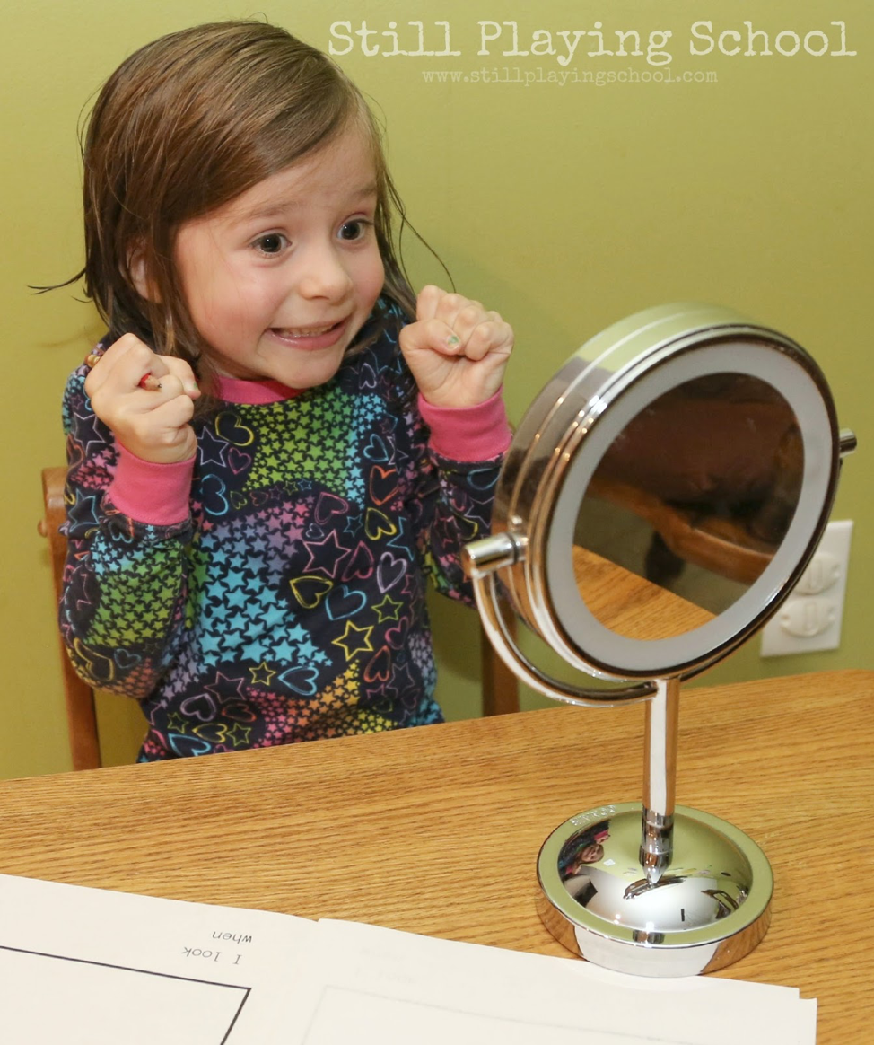 You can use a mirror to see out how your child’s face changes when they are mad, happy, and sad. You can discuss the details of what you see. Have your child draw how they look during each feeling, and discuss these feelings.