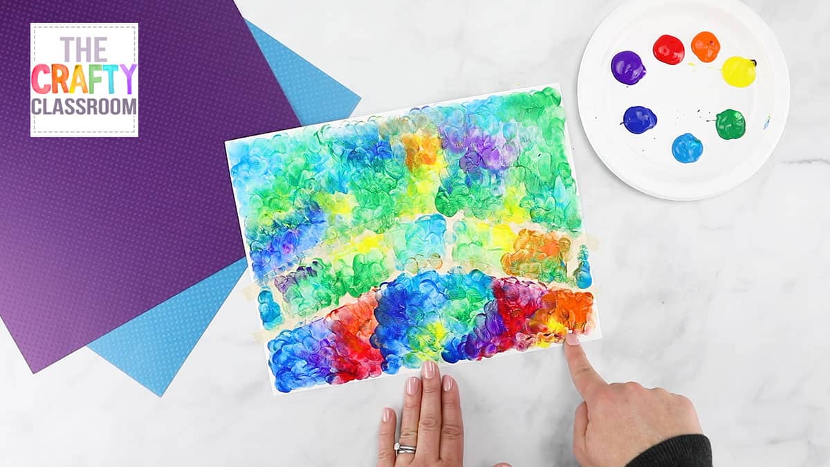 Time to fingerpaint! Provide students with a rainbow of colors for them to dip their fingers in, then show them how to dab their finger multiple times to start filling in the canvas.