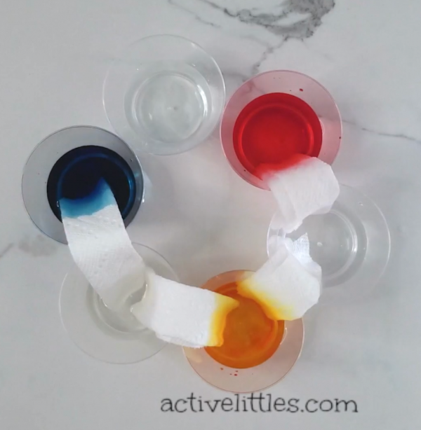 - Next, add paper towel strips to the cups so that one end was in the colored water and one end was in the empty cup. You will notice right away that the colored water will start to move up each paper towel strip!
