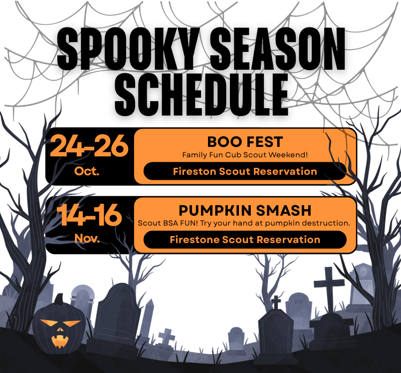 Join us at Boo Fest, October 24–26! Enjoy a weekend to remember filled with games, campfires, and nonstop fun for Cub Scouts and their families.
