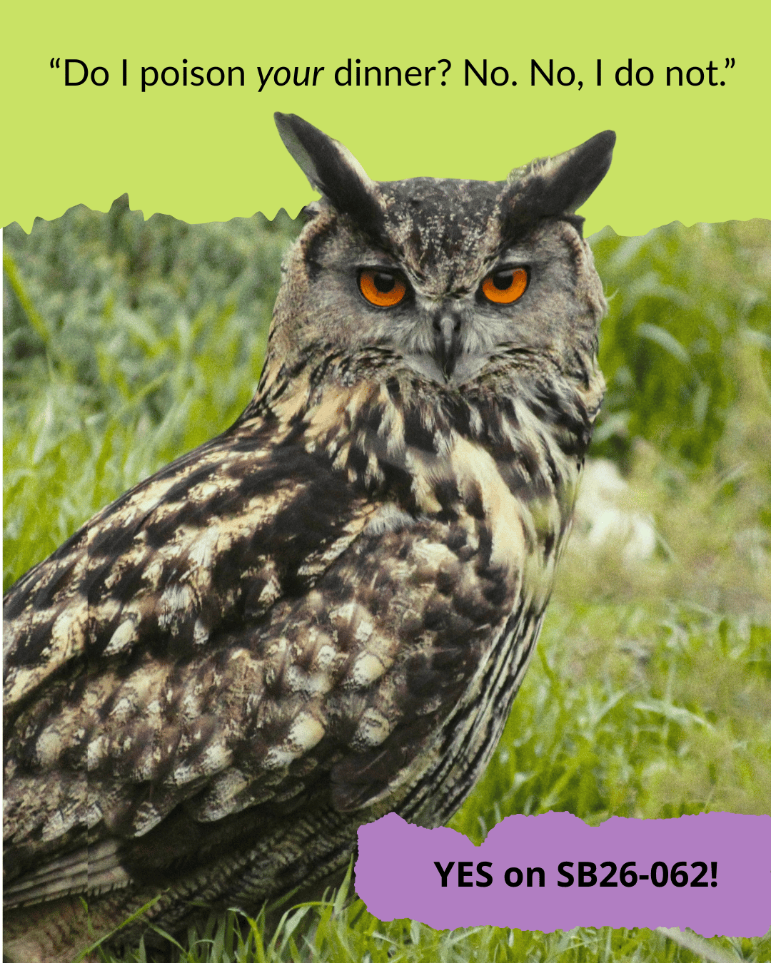 Rodenticides are a broad category of pesticides used to poison rats, mice, gophers, moles, and other rodents. They cause painful illness and death in both the targeted wildlife and animals that eat them, including coyotes, foxes, bobcats, owls, and eagles. If SB26-062 passed, Colorado would join California, Connecticut, Massachusetts, New Hampshire, New York, Vermont, and Washington who have all moved forward with similar legislation to protect children, pets, and wildlife. Please don't use rodenticides, and contact CO legislators in support of SB26-062, sponsored by Senators Cutter and Kipp and Representative Velasco.