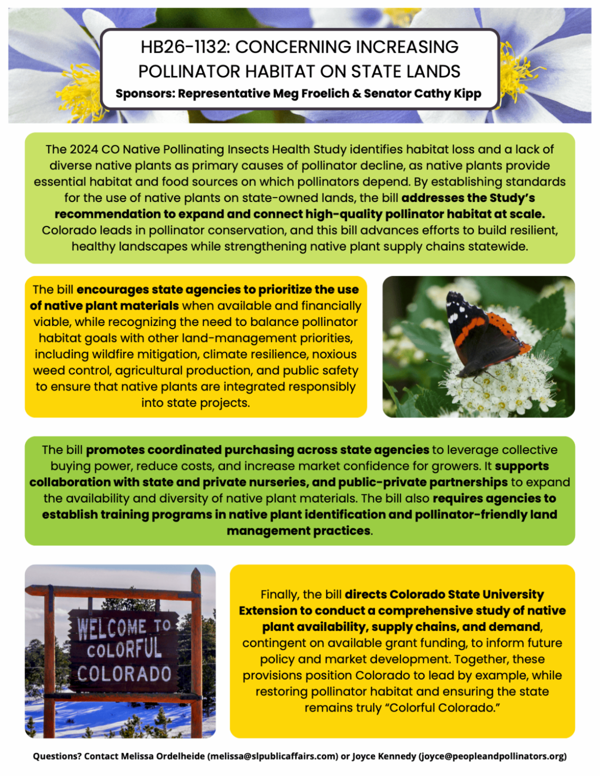 Colorado’s 2026 legislative session is underway. We encourage you to support several important bills that would have lasting impacts on pollinators, wildlife, and native plants. Join PPAN's Joyce Kennedy, Melissa Ordelheide of Siegel Long Public Affairs, Mark Surls of Project Coyote, and Lena Freij of Natural Resources Defense Council on February 25th at 12pm via Zoom. The webinar will feature an overview of the legislative process and the legislative outlook, as well as a closer look at three of PPAN’s Legislative Priorities: