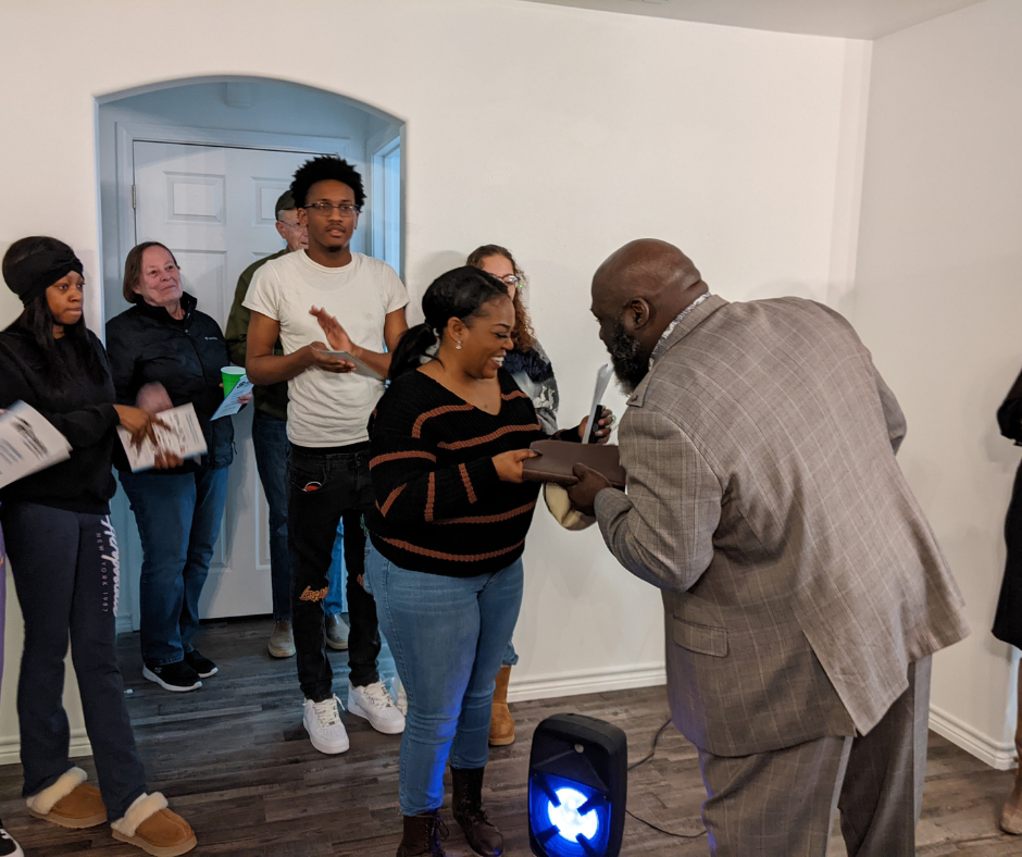 We were honored to have City of Denton Mayor Gerard Hudspeth in attendance to graciously speak on the issue of affordable housing in Denton and Habitat's important role in contributing to the solution. The Denton Quilt Guild blessed the family by donating a beautiful handmade quilt that was presented during the ceremony. Rev. Cedric Chambers of Mt. Calvary Baptist Church presented Shonbray with a Bible and led the crowd in the prayers of blessing over the home.