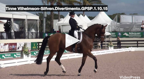 Divertimento, who can tend to be hot, settled nicely for Vilhelmson-Silfven and is beginning to come into his own at the Grand Prix level. "He's really learning, opening up his mind and listening to me now. He's much more with me now," she stated. "With a horse like this, you must have 150% focus for your entire ride. It is a matter of being in the exact same moment as him because the tiniest change from me can lead to mistakes."
