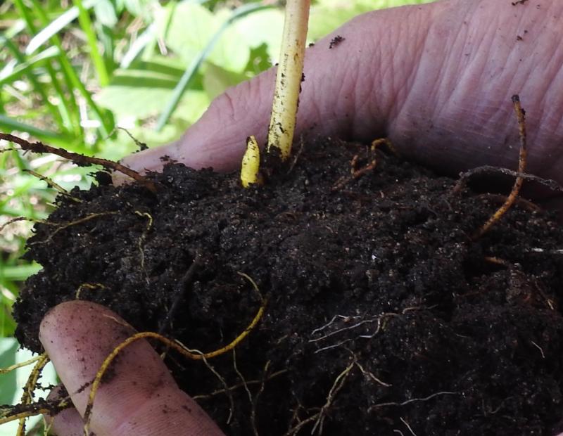 The most effective way to get forest roots going in woodland or shade garden is to plant them now! Rake back the mulch, dig a shallow hole, nestle the roots in with buds pointing up and rhizome horizontal to the ground, fill soil all around, pat it down, and replace the mulch over the top. Valuable plants like Goldenseal, Black Cohosh and Solomon's Seal may be marked with a sturdy stake and a plant label to assure that they are recognized, tended and appreciate when they emerge come spring. The old adage about perennial plants sometimes applies: "First year they sleep, second year they creep, third year they leap." But in actuality we often get flowers and fruits on our goldenseal the first year after transplant. Working with live roots in the fall assures success on a shoestring!
