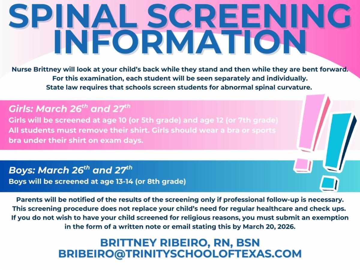 - Spinal Screening for 5th & 7th Grade Girls and 8th Grade Boys (Click Here for Details)