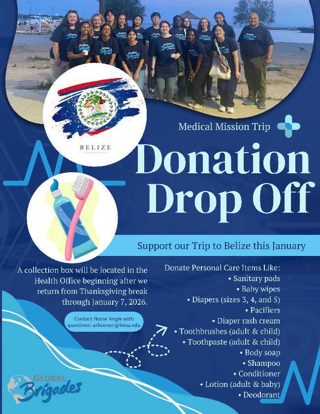 | Supply Drive for Medical Mission Trip | | This January, a group of students will be taking a medical mission trip to Belize. Part of their work will include bringing much-needed supplies to help care for the residents. If you would like to donate to their trip, they are collecting the following items. | | | |