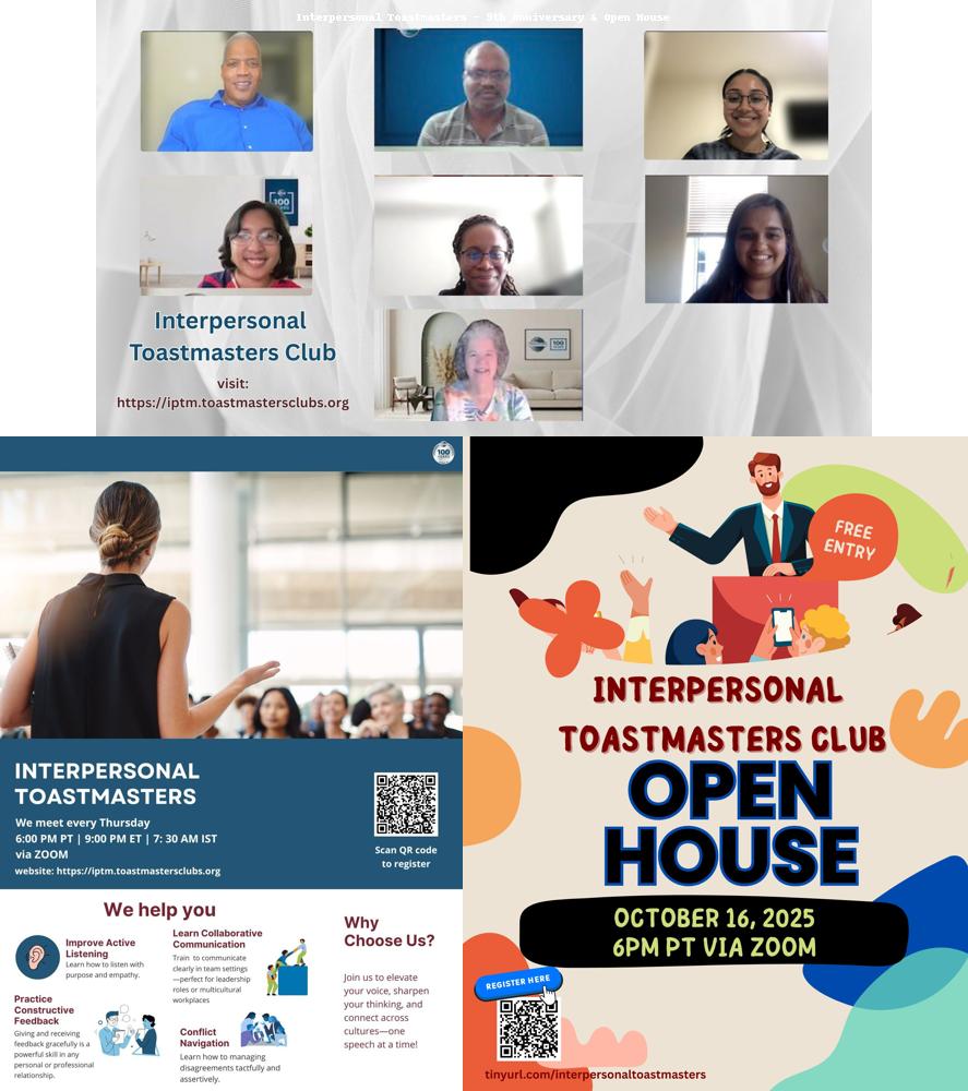 ✨ Upcoming Event: Join their Open House on October 16, 2025 at 6 PM PT (online) to experience their unique culture, meet members, and see why Interpersonal Toastmasters continues to shine.