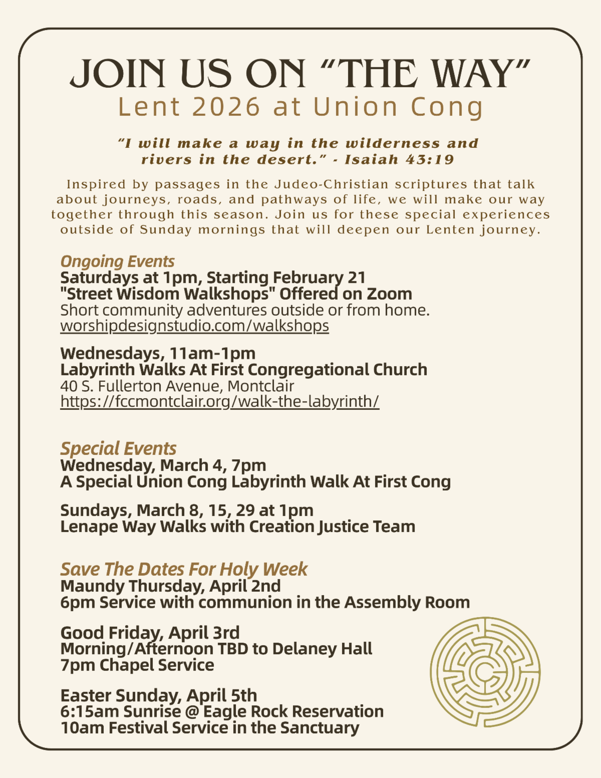 I'm excited to tell you that our combined Gospel service will again be held at Union Cong on April 19th at 10am. Last year's service was very uplifting and powerful, and this year will again be very special. As in the past, there will be four combined rehearsals before gospel weekend. All rehearsals will take place in the Union Cong Sanctuary. The rehearsal dates and times are as follows: