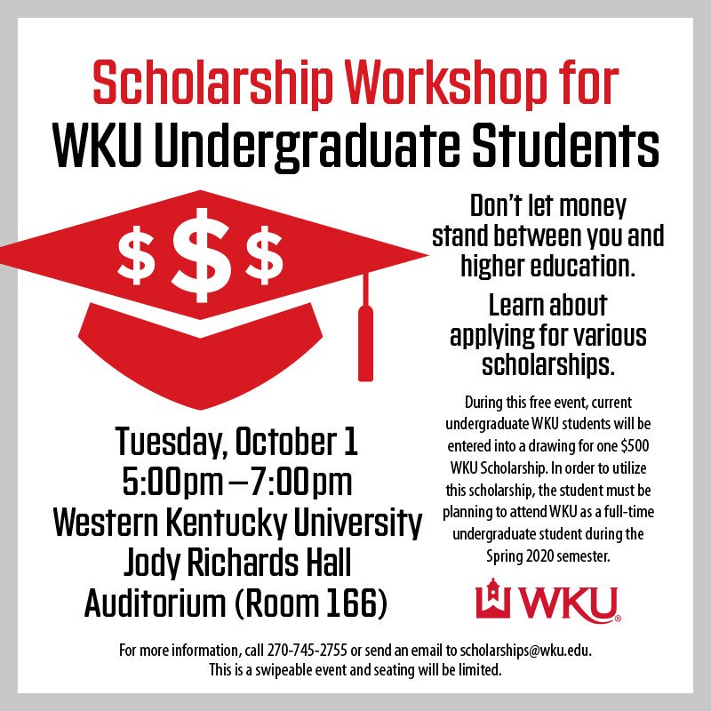 The Department of Student Financial Assistance will host a Scholarship Workshop for current undergraduate WKU students from 5 to 7 p.m. Tuesday at Jody Richards Hall Auditorium.