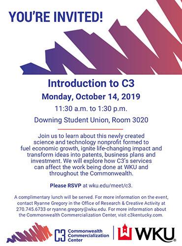The Office of Research and Creative Activity invites the WKU community to attend the Introduction to C3 presentations on Oct. 14. The Commonwealth Commercialization Center (C3) is Kentucky’s unprecedented engine for statewide innovation, created to fuel economic growth and ignite life-changing impact for individuals, businesses and communities. Faculty and staff are invited to the 11:30 a.m. session; students are invited to the 2 p.m. session.