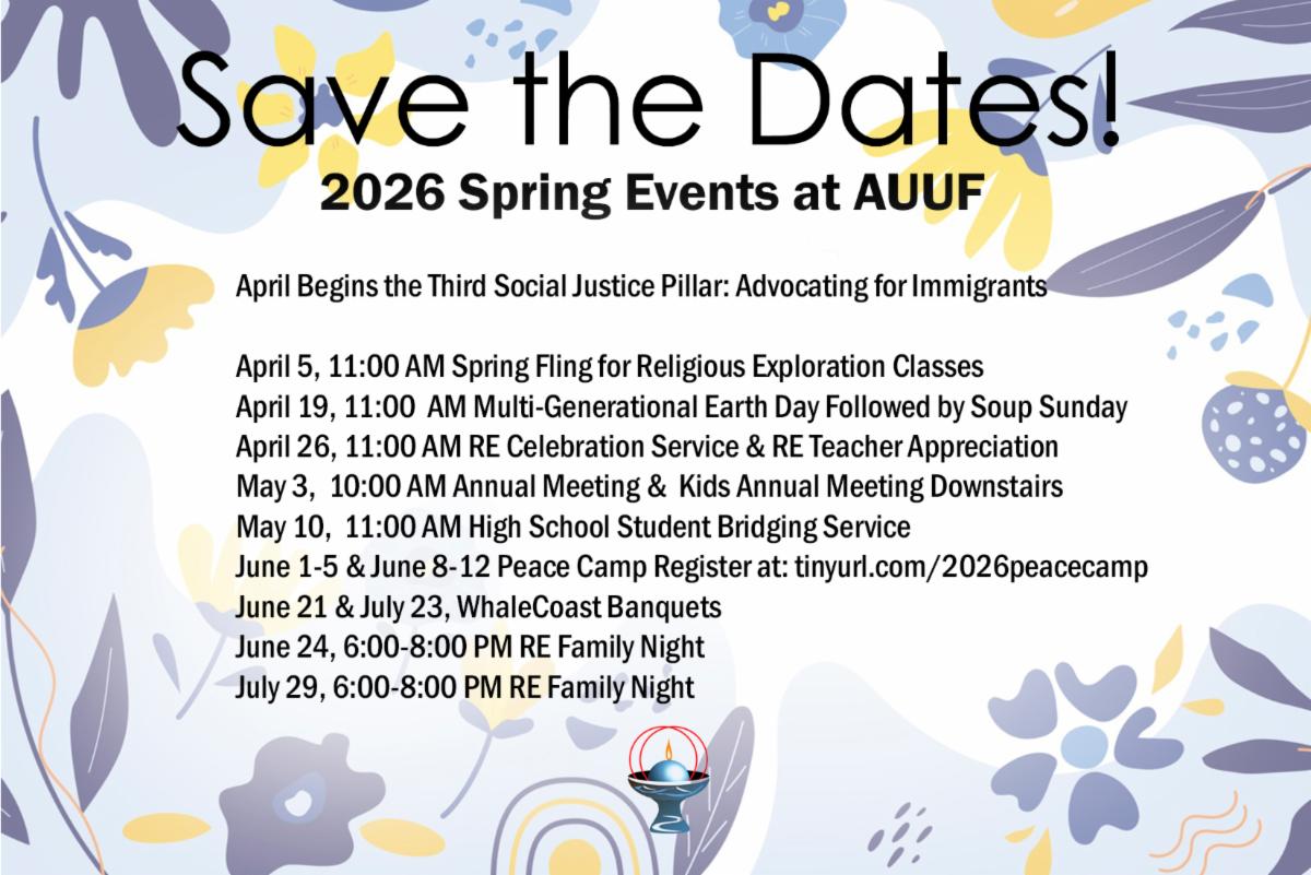 We're having our annual meeting again soon, 10:00 am May 3, 2026 where we'll decide on our budget for the next year (and implicitly how our budget serves our mission). We'll also talk about our Social Justice Pillars and how we'd like to proceed with these for next year. If you would like to participate in these decisions you need to be an official member by April 5. If you've been considering this for a while, or just now, please talk with Rev. Lise about any questions you may have and to sign our membership book. (If you don't want to join, you can still come to the meeting and express opinions and are welcome to do so.)