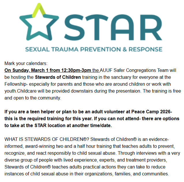 Please consider signing up to help make AUUF a warm and welcoming community. Encourage a friend or relative to join you! Every Sunday we need greeters, zoom ushers and Social Hour helpers to keep our kitchen tidy. Below is a link to the Signup Genius which includes downloadable directions on what to do. All you need is an email address and you will be sent an automatic reminder 2 days ahead of time. Thanks to all who continue to help!