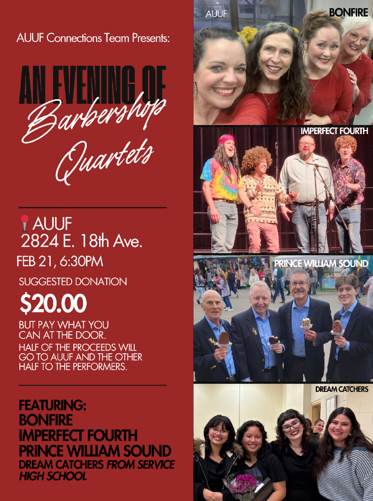 Greetings from the Connections Team. We are hosting a Quartet of Barbershop Quartets at the Fellowship this Saturday, Feb 21, 6:30-8pm. Everyone is welcome! Whether you're a regular at a cappella concerts or not -- come enjoy the variety, the talent, the energy of a part of Anchorage's huge Barbershop community! Featured groups: Bonfire (with someone you will know!), Imperfect Fourth, The Prince William Sound, and a student group from Service High School, the Dreamcatchers. Suggested donation of $20 - half of the proceeds will go to the AUUF, and half will go to the performers. Contact Katherine with any questions 907-342-9890.