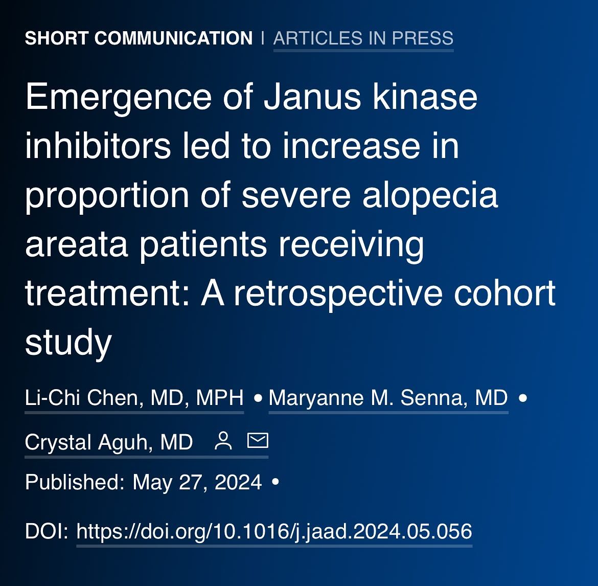 This JAAD article shows that following the first case report of Janus kinase inhibitors (JAKi) use in patients with alopecia areata (AA) in 2014, the proportion of patients with AA totalis/universalis seen in derm clinics increased significantly. This is 8 years before the first JAKi was approved to treat AA.