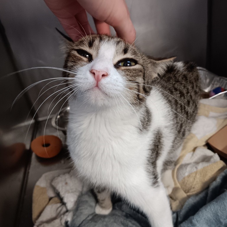 Rockie was adopted from us as a kitten in November of 2024 but came in as a stray at the end of July. Of course, due to his microchip, we were able to call his adopters immediately.