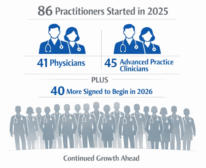 Inpatient admissions have increased 13% since 2023, and outpatient clinic visits are up 8% over three years. In 2025 alone, 86 new practitioners joined Bassett, with 40 more already signed to begin in 2026. More patients are choosing Bassett for care, and more professionals are choosing Bassett to build their careers.