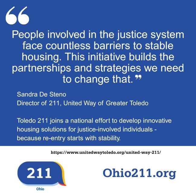 Sandra De Steno, Director of Toledo 211 at United Way, is one of the four representatives leading this effort locally. She works alongside partners from the Toledo Lucas County Homelessness Board, the Criminal Justice Coordinating Council, and the City of Toledo’s Housing and Community Development Department.