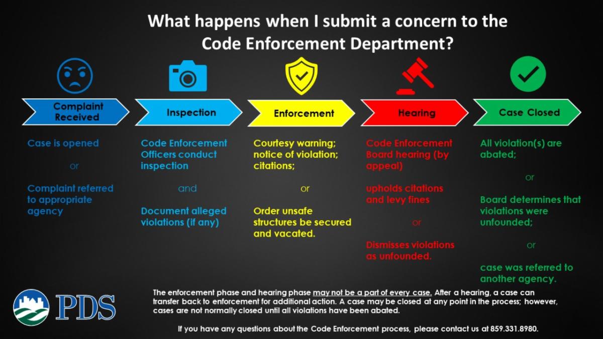 Any complaints and/or violations can be reported to 859.331.8980 or via email to info@fortwrightky.gov. Once received the complaint process is outlined in the below graphic.