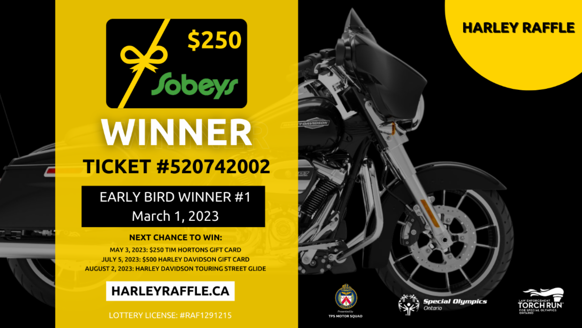 If you have the winning ticket number, please contact Derek Spence, Torch Run Ontario Manager, at dereks@torchrunontario.com or by phone at (226) 376-1167, to claim your prize!