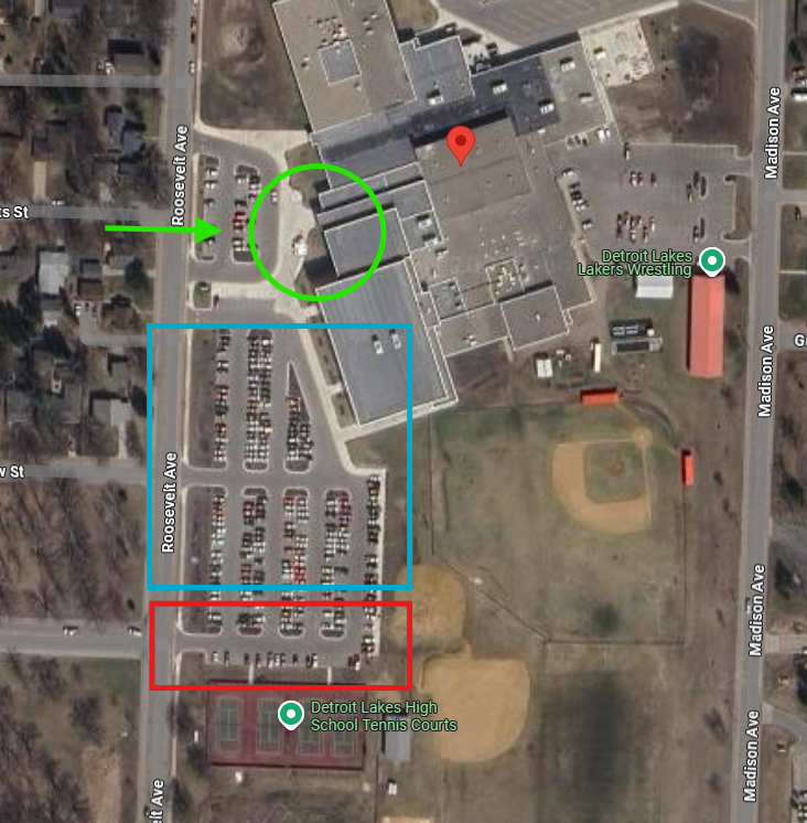 • Packet pickup & walk-up registration will take place Saturday morning from 7:00-8:15AM at the Detroit Lakes High School (1301 Roosevelt Ave., Detroit Lakes, MN - in the West parking lot along Roosevelt Ave. (see green circle on map.)