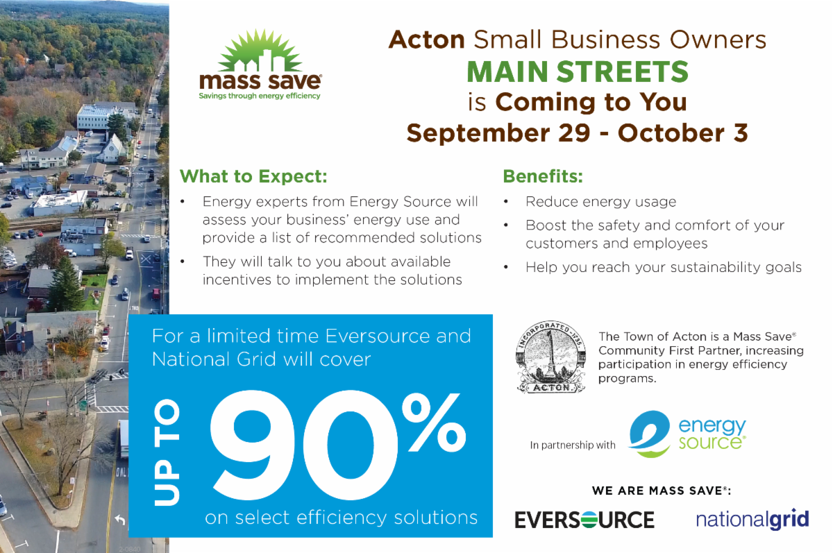 From September 19 to October 3, Acton business owners will have the opportunity to participate in a new initiative to assess and reduce their energy costs. This program is the result of a collaboration between the Town of Acton, National Grid, Eversource, and Mass Save. Outreach to local businesses has already begun, and those with questions or interested in participating can contact Sophia Darsch at sdarsch@acton-ma.gov
