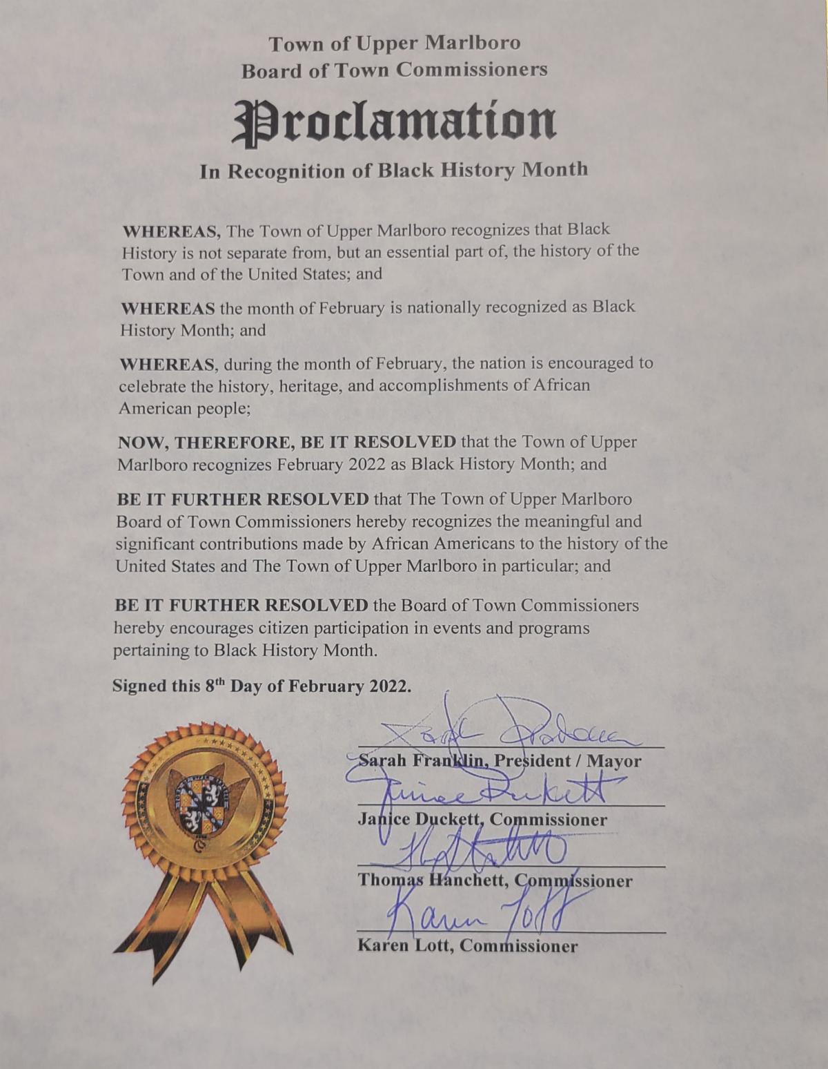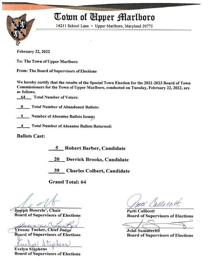 UPPER MARLBORO, MD (Tuesday, Feb. 22, 2022) – For the first time in its 326-year history, the Town of Upper Marlboro will now have five members on its governing Board of Commissioners. In a special election held today, Town voters elected Prince George’s County native Charles Colbert to serve on the board. Colbert was one of three candidates seeking to occupy a vacant seat on the panel.