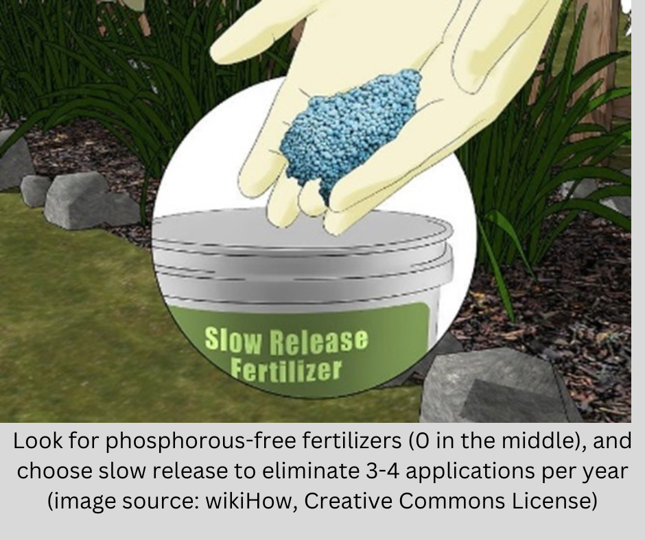 Use phosphorous-free fertilizers unless your soil is lacking in 'P', and use slow-release nitrogen fertilizers or organic compost.