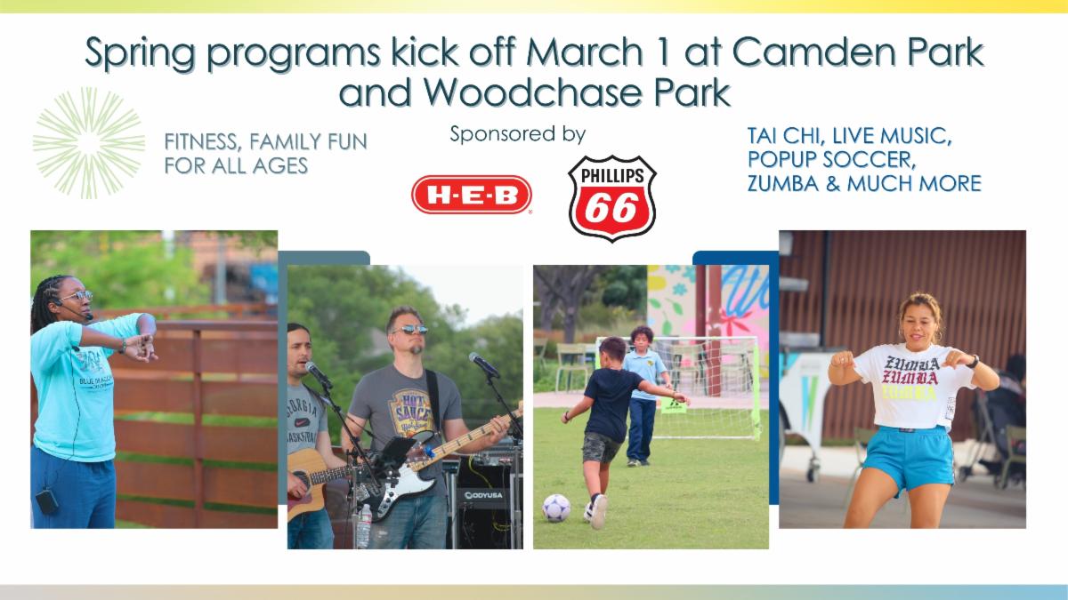 Thanks to major 2026 Programs and Events Sponsors like H-E-B and Phillips 66, Camden Park, a lively community greenspace with free daily programs, is rolling out its spring 2026 schedule of activities for all ages. Weekly favorites return starting the week of March 1, 2026, including Zumba, Tai Chi, Run Club, and Storytime with the Houston Public Library. Kids can enjoy Children’s Bingo, Scavenger Hunts, and creative play with Big Blue Blocks throughout the week. Weekend programming features Boot Camp, Yoga, and special offerings like children’s ballet and Young Audiences of Houston workshops focused on music, dance, and theatre. The park’s expansive lawn and pavilion provide a welcoming backdrop for fitness, play, and cultural experiences in the heart of Westchase. Stay tuned for more program announcements! See calendar What’s Coming Up at Woodchase Park Woodchase Park continues its lineup of free weekly programs for kids and adults that keep the activity lawn buzzing. Look for Pop-Up Soccer on Mondays, Wednesdays, and Fridays, Children’s Bingo on Tuesdays and Thursdays, and Zumba fitness midweek. Creative play is always on offer with the Imagination Playground “Big Blue Blocks”, and Young Audiences of Houston workshops bring arts and performance programs to the park on Sundays. Seasonal and specialty events, including Spring Break activities and Summer Movie Nights, and family play days, round out the calendar, making Woodchase a go-to spot for weekly fun. See calendar