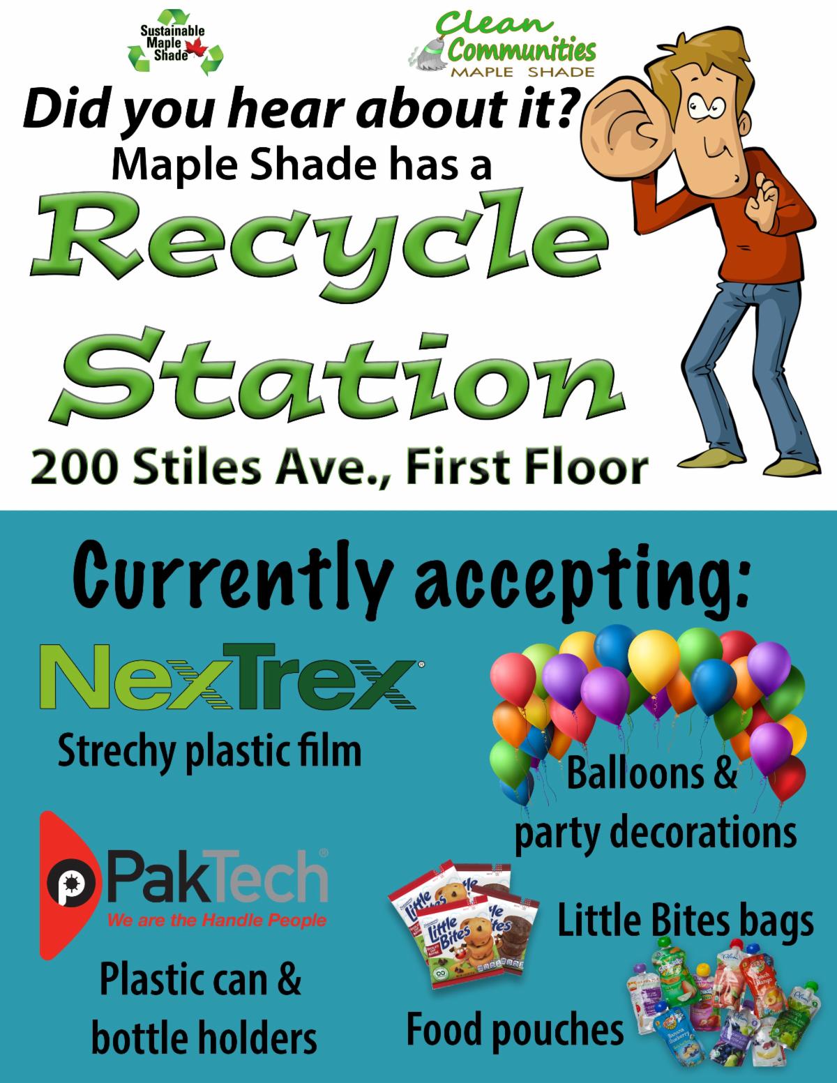 The Recycling Station is at the Maple Shade Municipal Building located at 200 Stiles Avenue on the 1st floor. It has multiple bins to recycle stuff not accepted in the regular stream. There’s a box to recycle balloons and other party decorations. There’s also NexTrex bins to bring any stretchy plastic film and bags, a PakTech can for plastic six- and four-pack holders and bottle holders and receptacle for food pouches with lids and Entenmann's Mini Muffins bags. Do the green thing and dispose of these items the proper way.